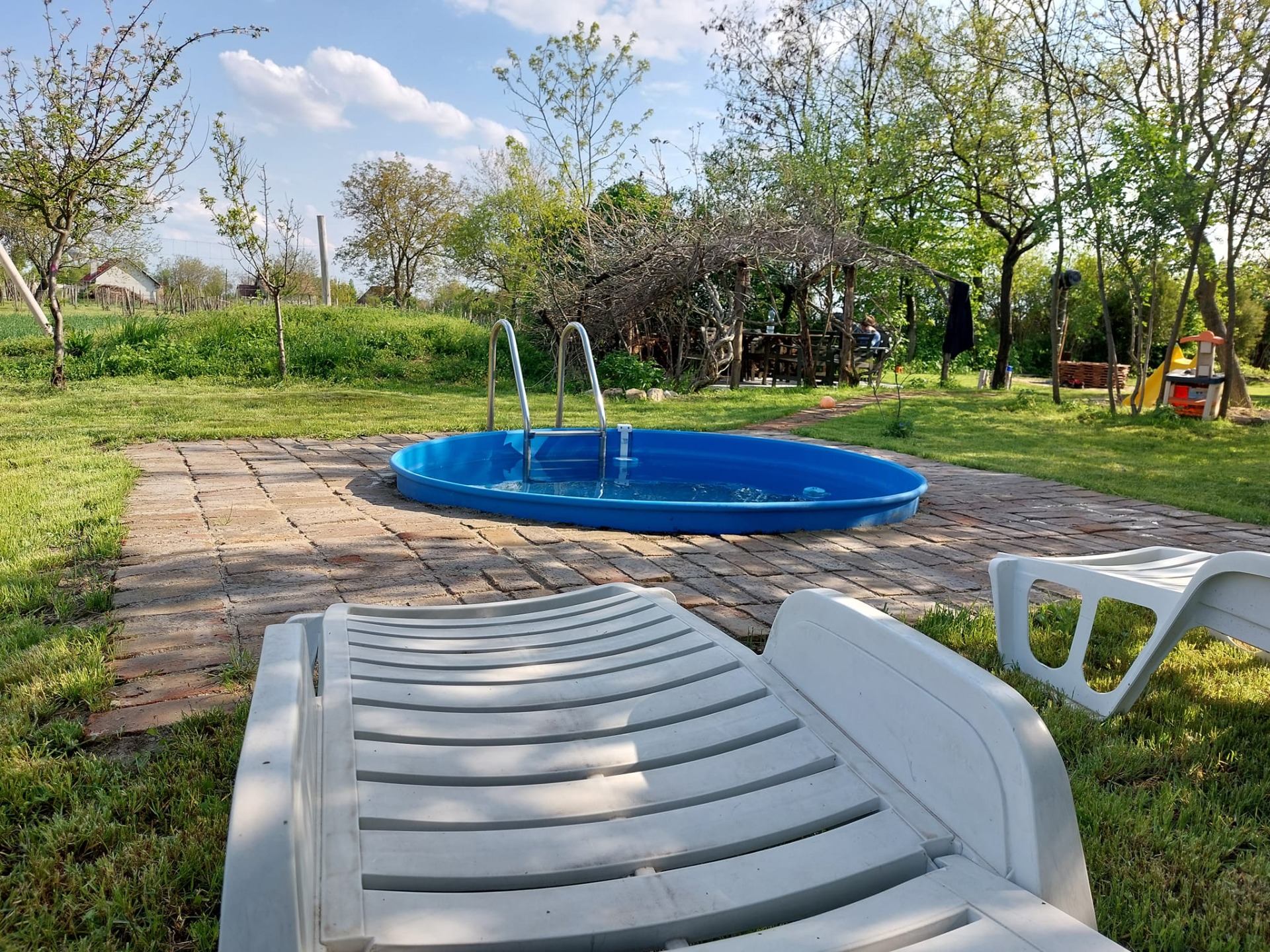 Az udvar hátsó részében található süllyesztett kör alakú medencénk, melyet a gyerekek is nyugodtan használhatnak a nyári melegben, amíg a szülők a napágyakon pihennek.